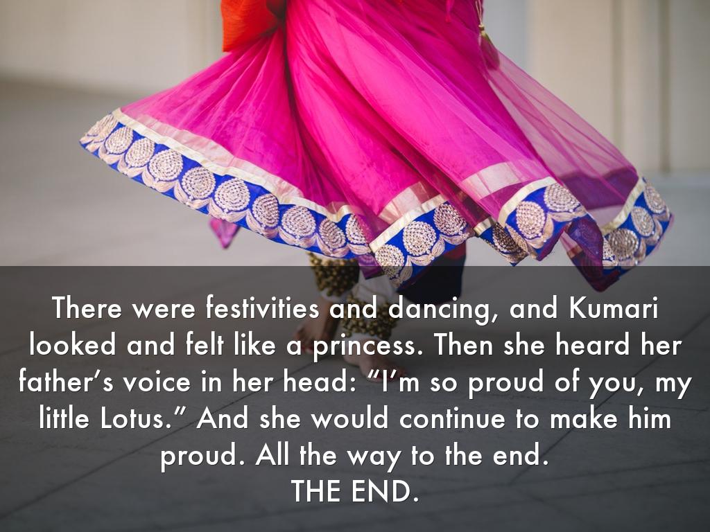 There were festivities and dancing, and Kumari looked and felt like a princess. Then she heard her father’s voice in her head: “I’m so proud of you, my little Lotus.” And she would continue to make him proud. All the way to the end.