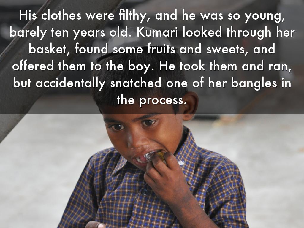 His clothes were filthy, and he was so young, barely ten years old. Kumari looked through her basket, found some fruits and sweets, and offered them to the boy. He took them and ran, but accidentally snatched one of her bangles in the process.