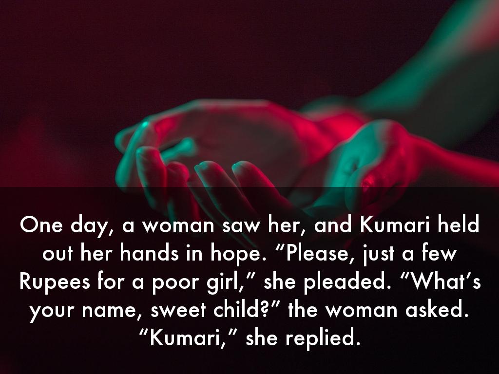 One day, a woman saw her, and Kumari held out her hands in hope. “Please, just a few Rupees for a poor girl,” she pleaded. “What’s your name, sweet child?” the woman asked. “Kumari,” she replied.