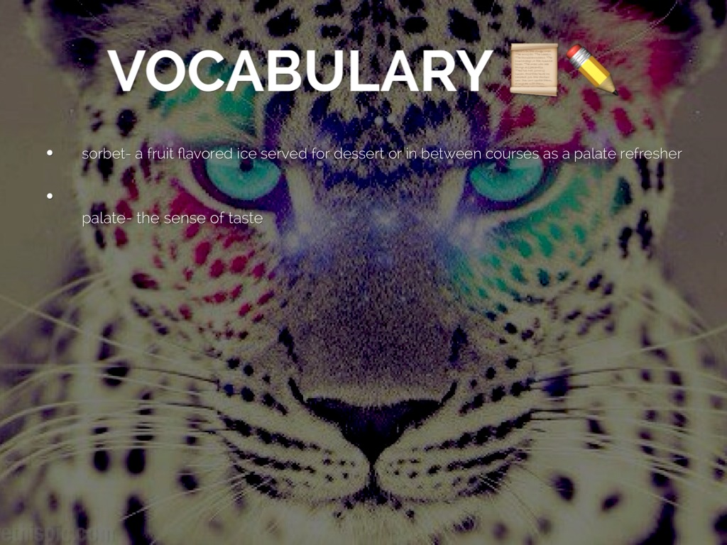 sorbet- a fruit flavored ice served for dessert or in between courses as a palate refresher