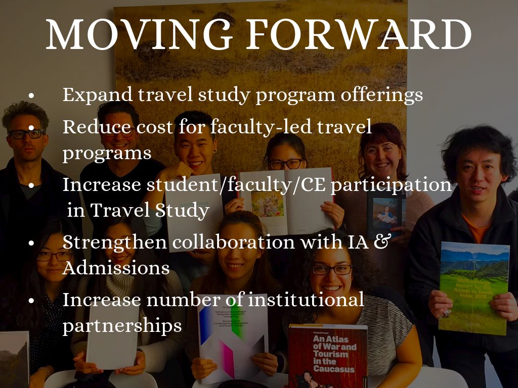 2014-2015: CIE begins establishing institutional partnerships to expand semester exchange opportunities. CIE begins to develop travel coordination strategies with IA and Admissions to connect with alumni and prospective students.