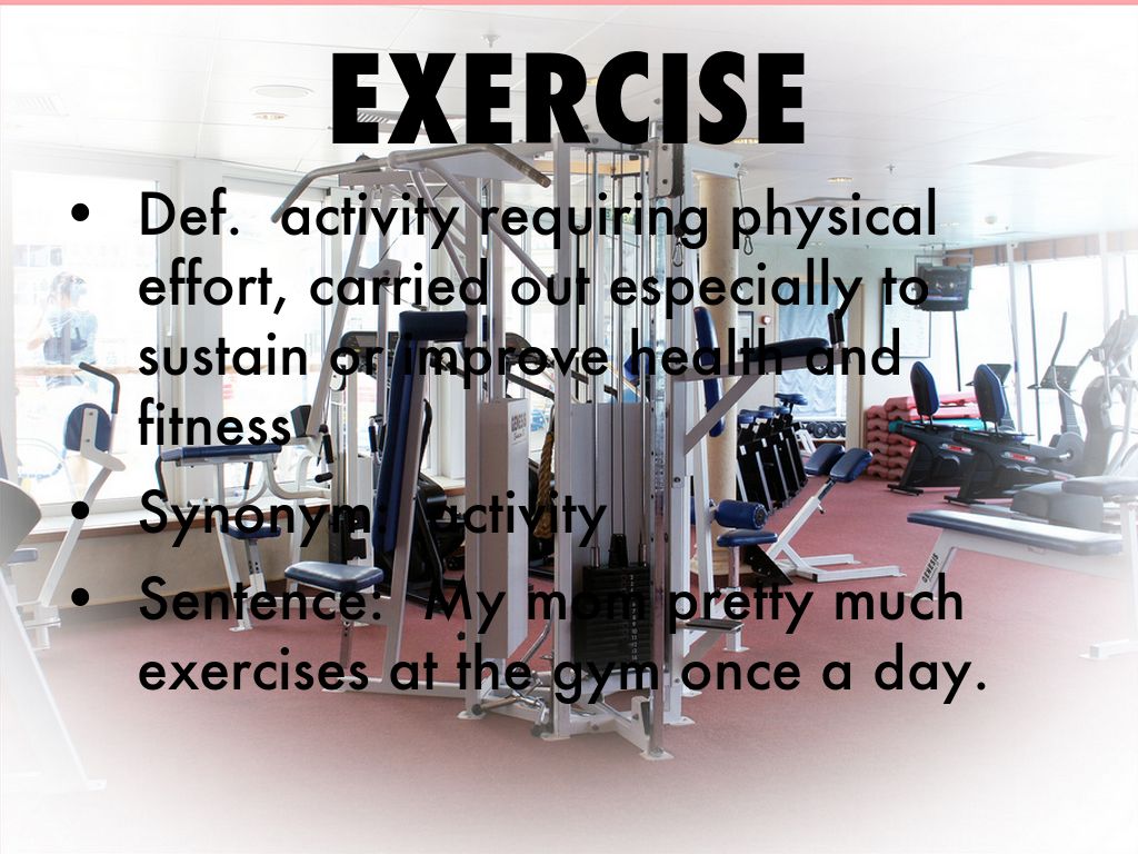 Def. activity requiring physical effort, carried out especially to sustain or improve health and fitness