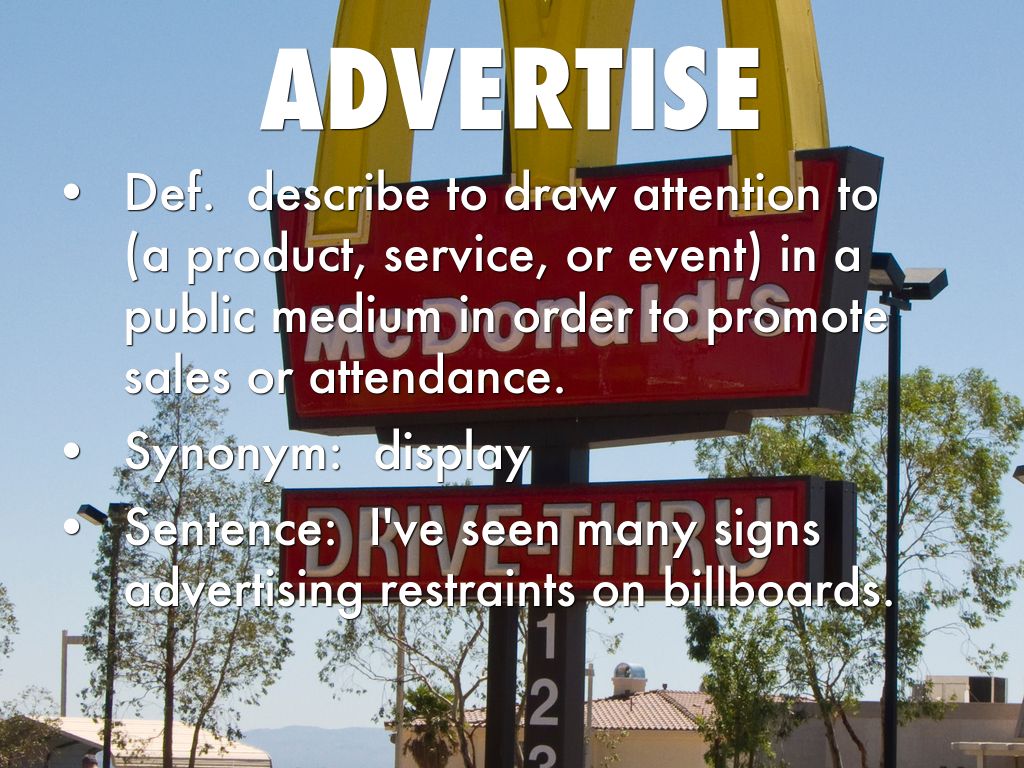Def. describe to draw attention to (a product, service, or event) in a public medium in order to promote sales or attendance.