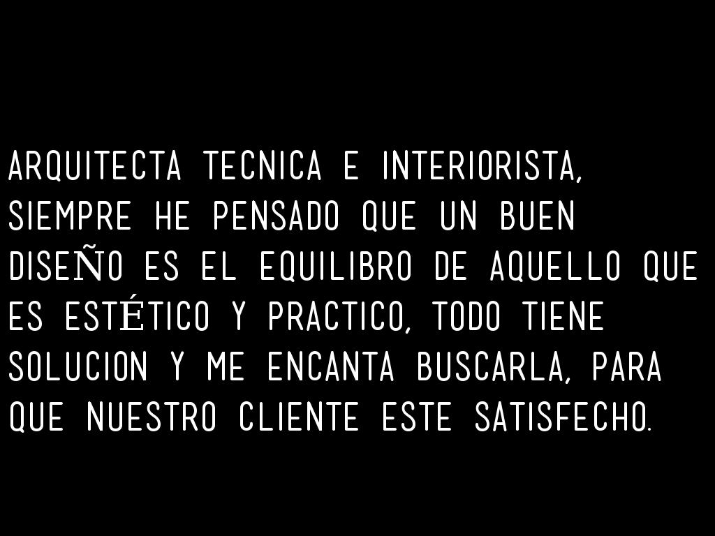 ARQUITECTA TECNICA E INTERIORISTA, SIEMPRE HE PENSADO QUE UN BUEN DISEÑO ES EL EQUILIBRO DE AQUELLO QUE ES ESTÉTICO Y PRACTICO, TODO TIENE SOLUCION Y ME ENCANTA BUSCARLA, PARA QUE NUESTRO CLIENTE ESTE SATISFECHO.
