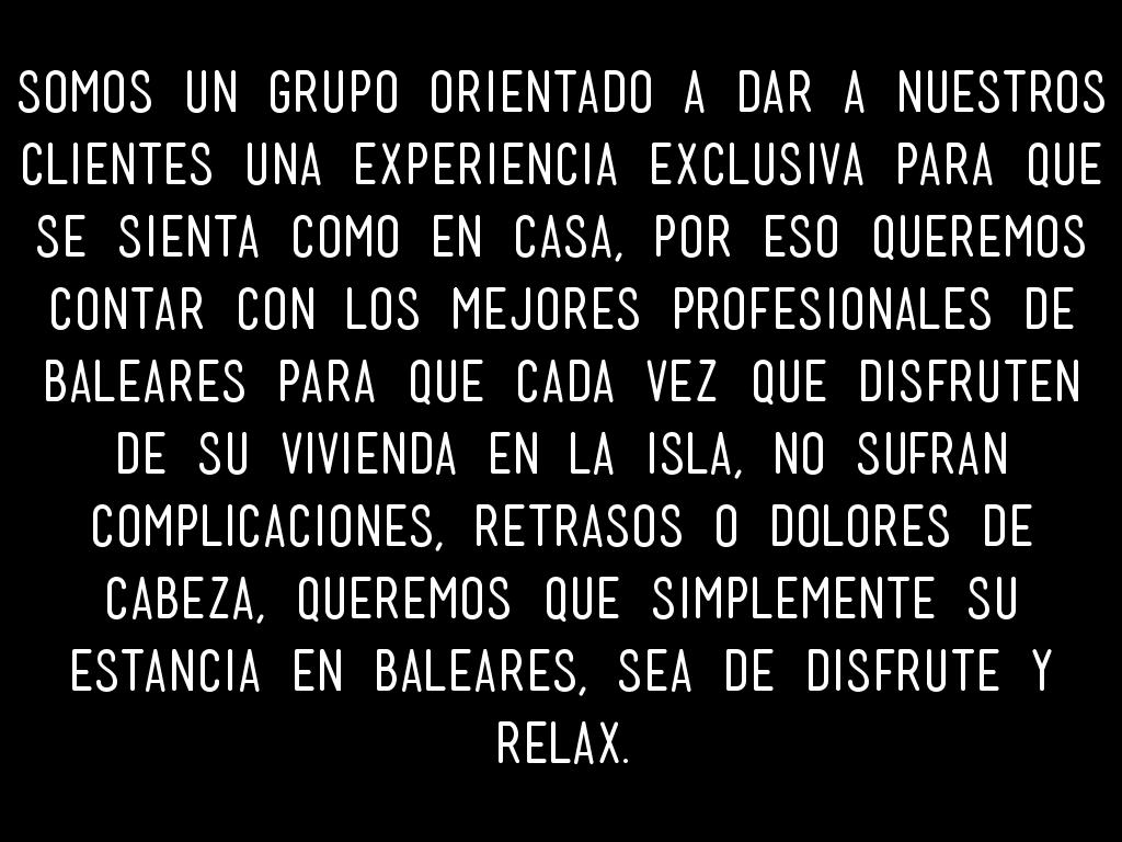 Somos un grupo orientado a dar a nuestros clientes una experiencia exclusiva para que se sienta como en casa, por eso queremos contar con los mejores profesionales de Baleares para que cada vez que disfruten de su vivienda en la isla, no sufran complicaciones, retrasos o dolores de cabeza, queremos que simplemente su estancia en Baleares, sea de disfrute y relax.