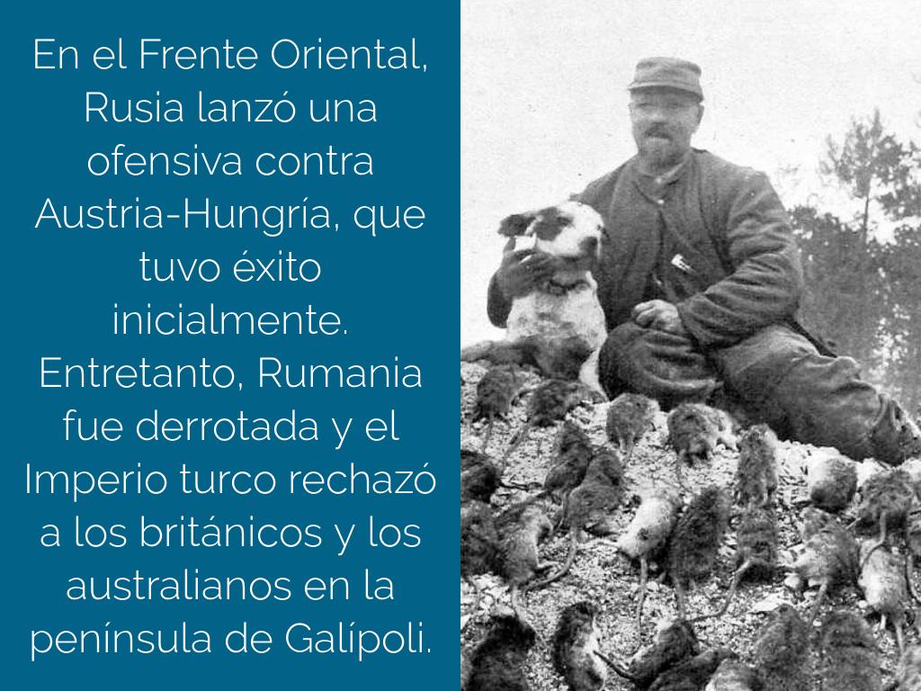En el Frente Oriental, Rusia lanzó una ofensiva contra Austria-Hungría, que tuvo éxito inicialmente. Entretanto, Rumania fue derrotada y el Imperio turco rechazó a los británicos y los australianos en la península de Galípoli.