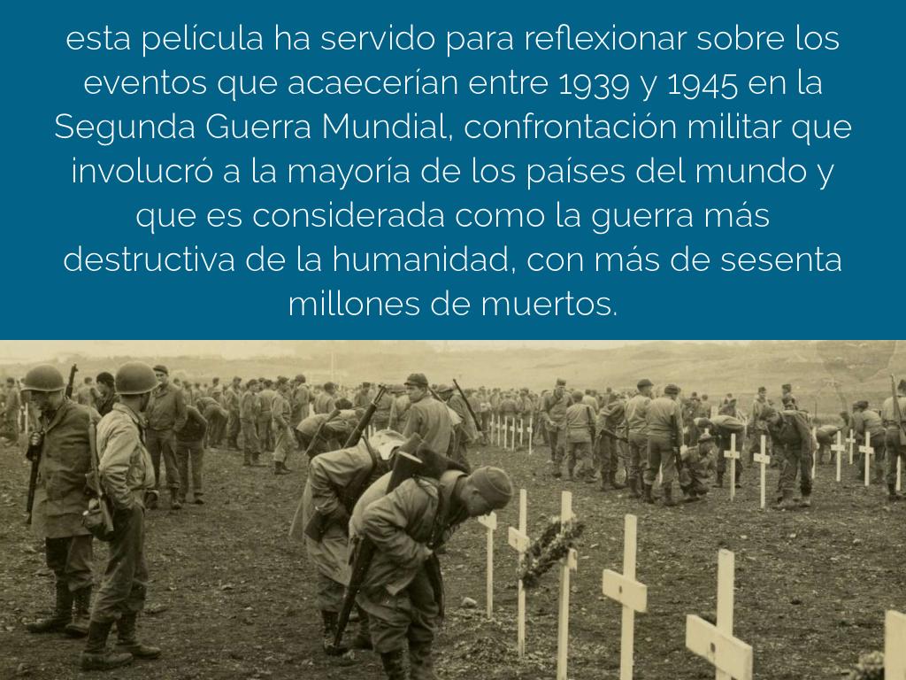 esta película ha servido para reflexionar sobre los eventos que acaecerían entre 1939 y 1945 en la Segunda Guerra Mundial, confrontación militar que involucró a la mayoría de los países del mundo y que es considerada como la guerra más destructiva de la humanidad, con más de sesenta millones de muertos.