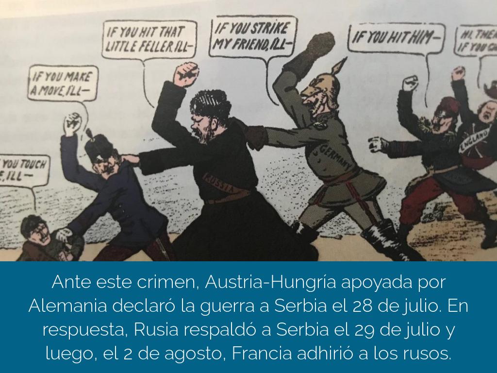 Ante este crimen, Austria-Hungría apoyada por Alemania declaró la guerra a Serbia el 28 de julio. En respuesta, Rusia respaldó a Serbia el 29 de julio y luego, el 2 de agosto, Francia adhirió a los rusos.