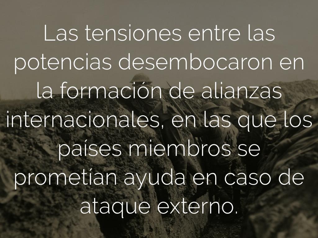 Las tensiones entre las potencias desembocaron en la formación de alianzas internacionales, en las que los países miembros se prometían ayuda en caso de ataque externo.