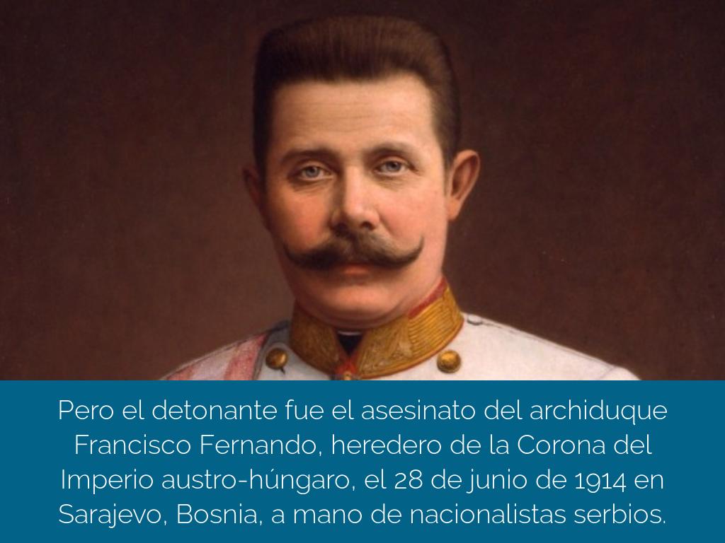 Pero el detonante fue el asesinato del archiduque Francisco Fernando, heredero de la Corona del Imperio austro-húngaro, el 28 de junio de 1914 en Sarajevo, Bosnia, a mano de nacionalistas serbios.