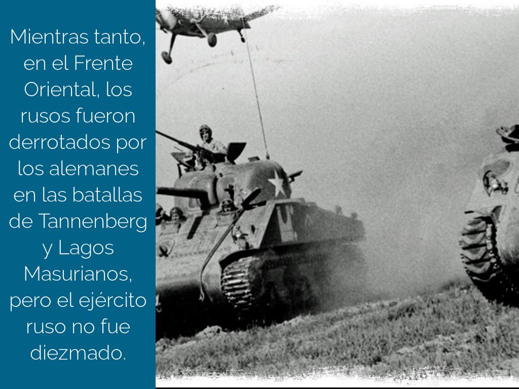 Mientras tanto, en el Frente Oriental, los rusos fueron derrotados por los alemanes en las batallas de Tannenberg y Lagos Masurianos, pero el ejército ruso no fue diezmado.
