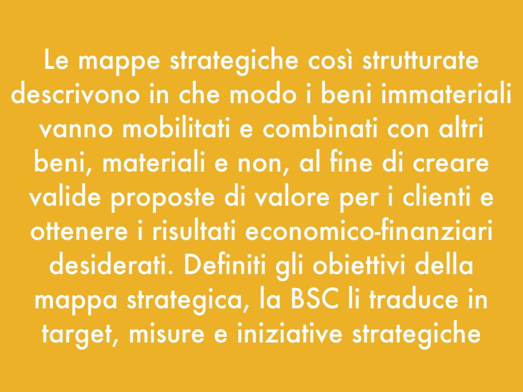 Le mappe strategiche così strutturate descrivono in che modo i beni immateriali vanno mobilitati e combinati con altri beni, materiali e non, al fine di creare valide proposte di valore per i clienti e ottenere i risultati economico-finanziari desiderati. Definiti gli obiettivi della mappa strategica, la BSC li traduce in target, misure e iniziative strategiche