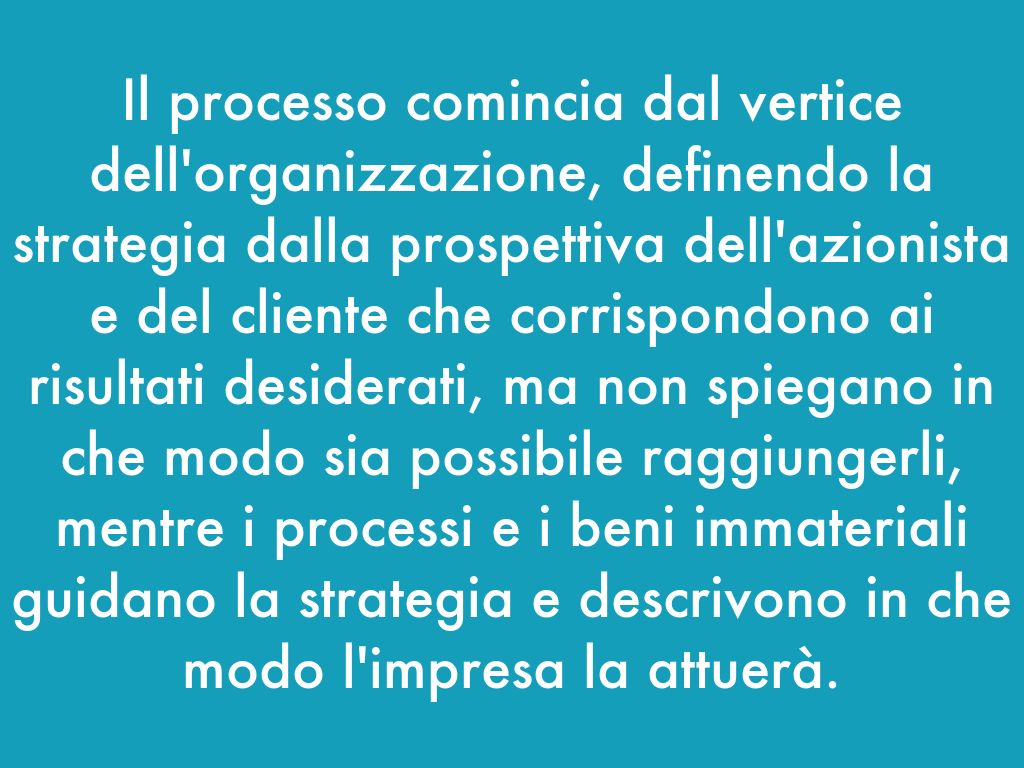 Il processo comincia dal vertice dell'organizzazione, definendo la strategia dalla prospettiva dell'azionista e del cliente che corrispondono ai risultati desiderati, ma non spiegano in che modo sia possibile raggiungerli, mentre i processi e i beni immateriali guidano la strategia e descrivono in che modo l'impresa la attuerà.