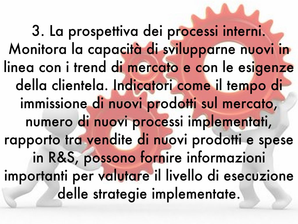 Monitora la capacità di svilupparne nuovi in linea con i trend di mercato e con le esigenze della clientela. Indicatori come il tempo di immissione di nuovi prodotti sul mercato, numero di nuovi processi implementati, rapporto tra vendite di nuovi prodotti e spese in R&S, possono fornire informazioni importanti per valutare il livello di esecuzione delle strategie implementate.