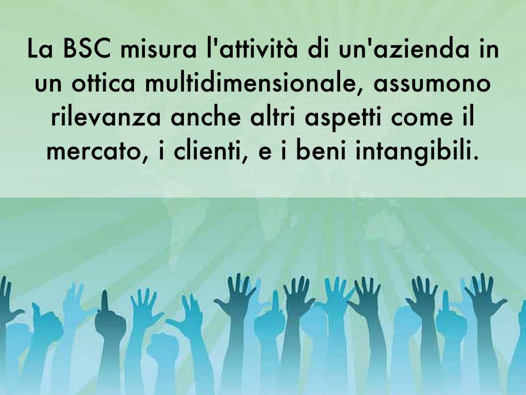 La BSC misura l'attività di un'azienda in un ottica multidimensionale, assumono rilevanza anche altri aspetti come il mercato, i clienti, e i beni intangibili.