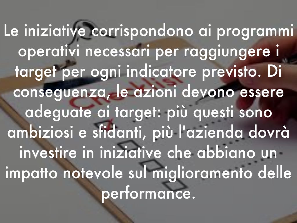Le iniziative corrispondono ai programmi operativi necessari per raggiungere i target per ogni indicatore previsto. Di conseguenza, le azioni devono essere adeguate ai target: più questi sono ambiziosi e sfidanti, più l'azienda dovrà investire in iniziative che abbiano un impatto notevole sul miglioramento delle performance.