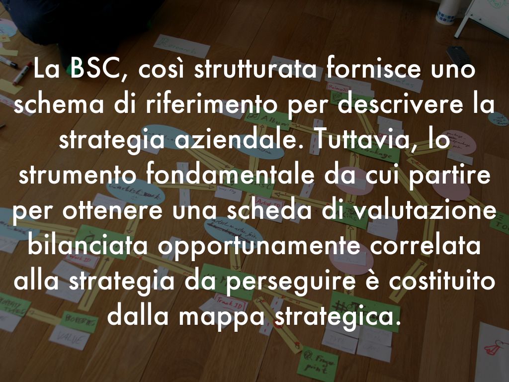 La BSC, così strutturata fornisce uno schema di riferimento per descrivere la strategia aziendale. Tuttavia, lo strumento fondamentale da cui partire per ottenere una scheda di valutazione bilanciata opportunamente correlata alla strategia da perseguire è costituito dalla mappa strategica.