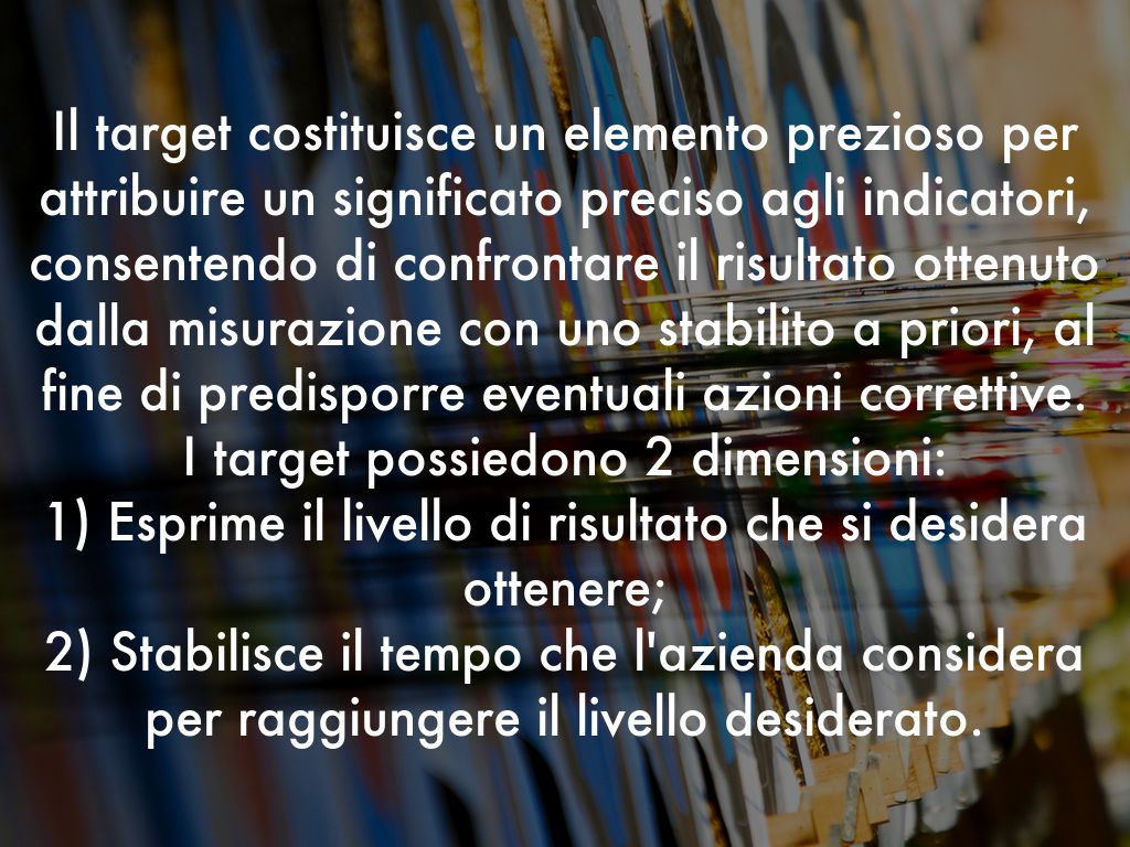 Il target costituisce un elemento prezioso per attribuire un significato preciso agli indicatori, consentendo di confrontare il risultato ottenuto dalla misurazione con uno stabilito a priori, al fine di predisporre eventuali azioni correttive.