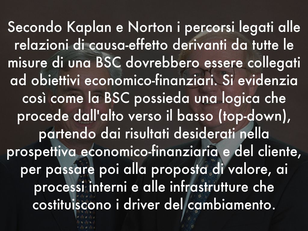Secondo Kaplan e Norton i percorsi legati alle relazioni di causa-effetto derivanti da tutte le misure di una BSC dovrebbero essere collegati ad obiettivi economico-finanziari. Si evidenzia così come la BSC possieda una logica che procede dall'alto verso il basso (top-down), partendo dai risultati desiderati nella prospettiva economico-finanziaria e del cliente, per passare poi alla proposta di valore, ai processi interni e alle infrastrutture che costituiscono i driver del cambiamento.
