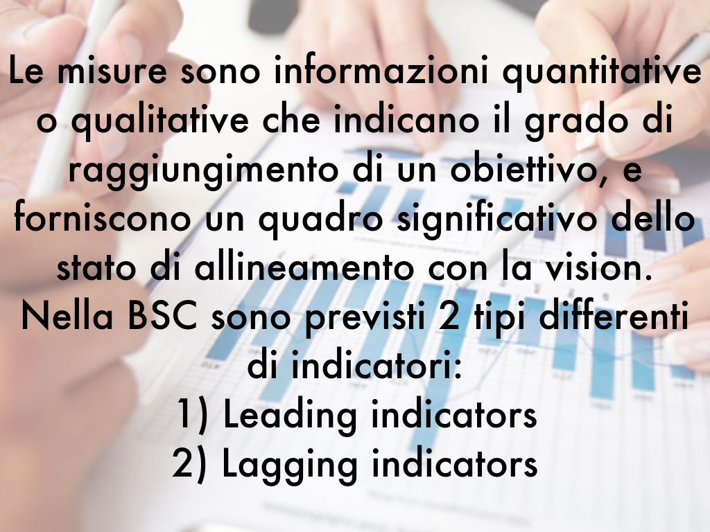 Le misure sono informazioni quantitative o qualitative che indicano il grado di raggiungimento di un obiettivo, e forniscono un quadro significativo dello stato di allineamento con la vision.
