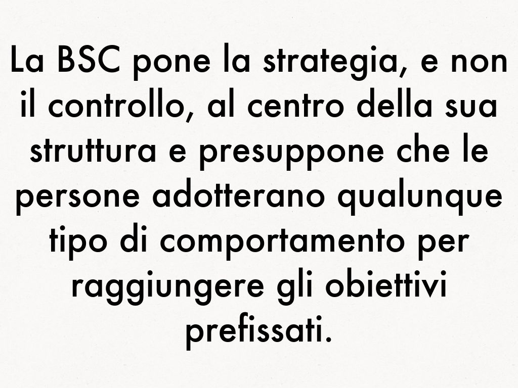 La BSC pone la strategia, e non il controllo, al centro della sua struttura e presuppone che le persone adotterano qualunque tipo di comportamento per raggiungere gli obiettivi prefissati.