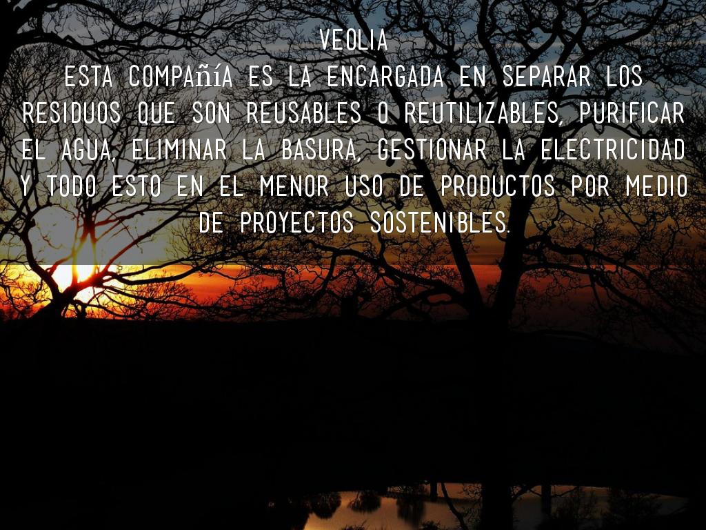 Veolia Esta compañía es la encargada en separar los residuos que son reusables o reutilizables, purificar el agua, eliminar la basura, gestionar la electricidad y todo esto en el menor uso de productos por medio de proyectos sostenibles.