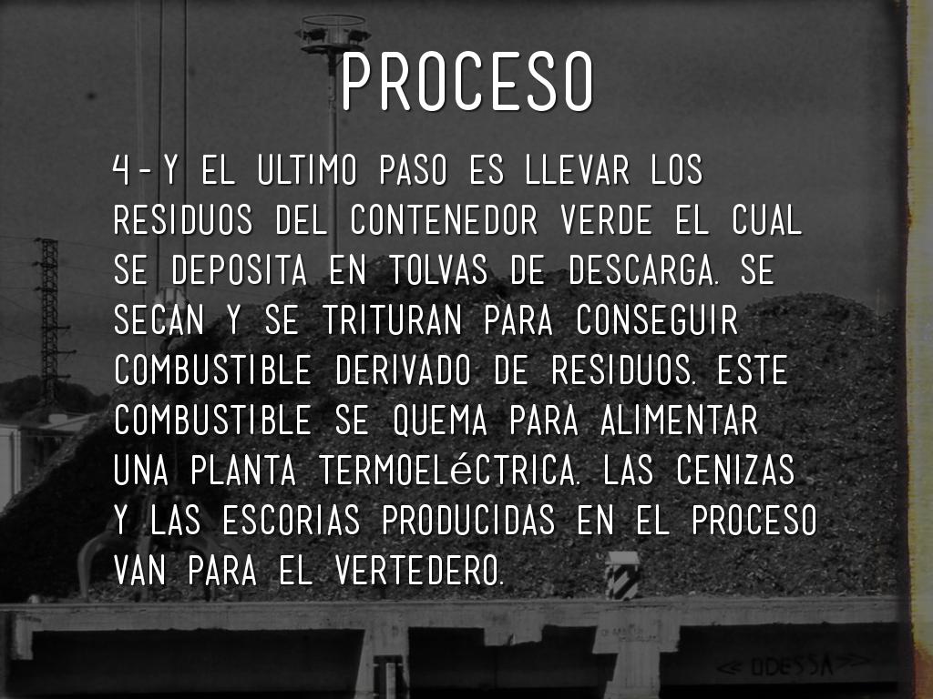 4-y el ultimo paso es llevar los residuos del CONTENEDOR VERDE el cual se deposita en tolvas de descarga. Se secan y se trituran para conseguir Combustible Derivado de Residuos. Este combustible se quema para alimentar una planta termoeléctrica. Las cenizas y las escorias producidas en el proceso van para el vertedero.
