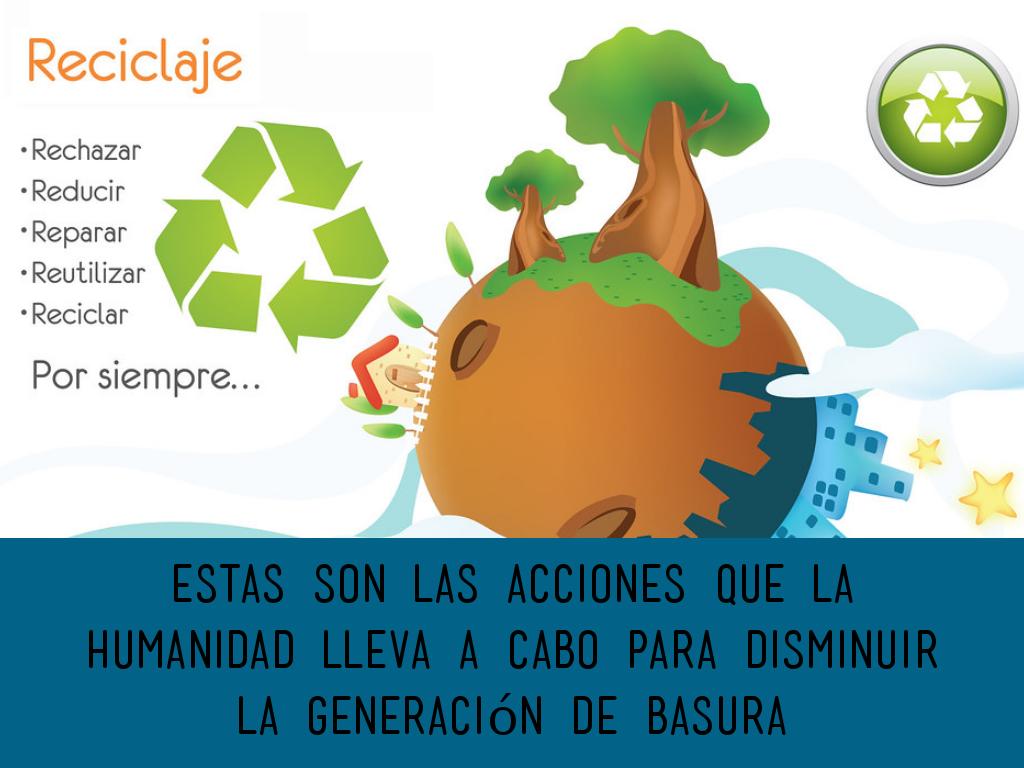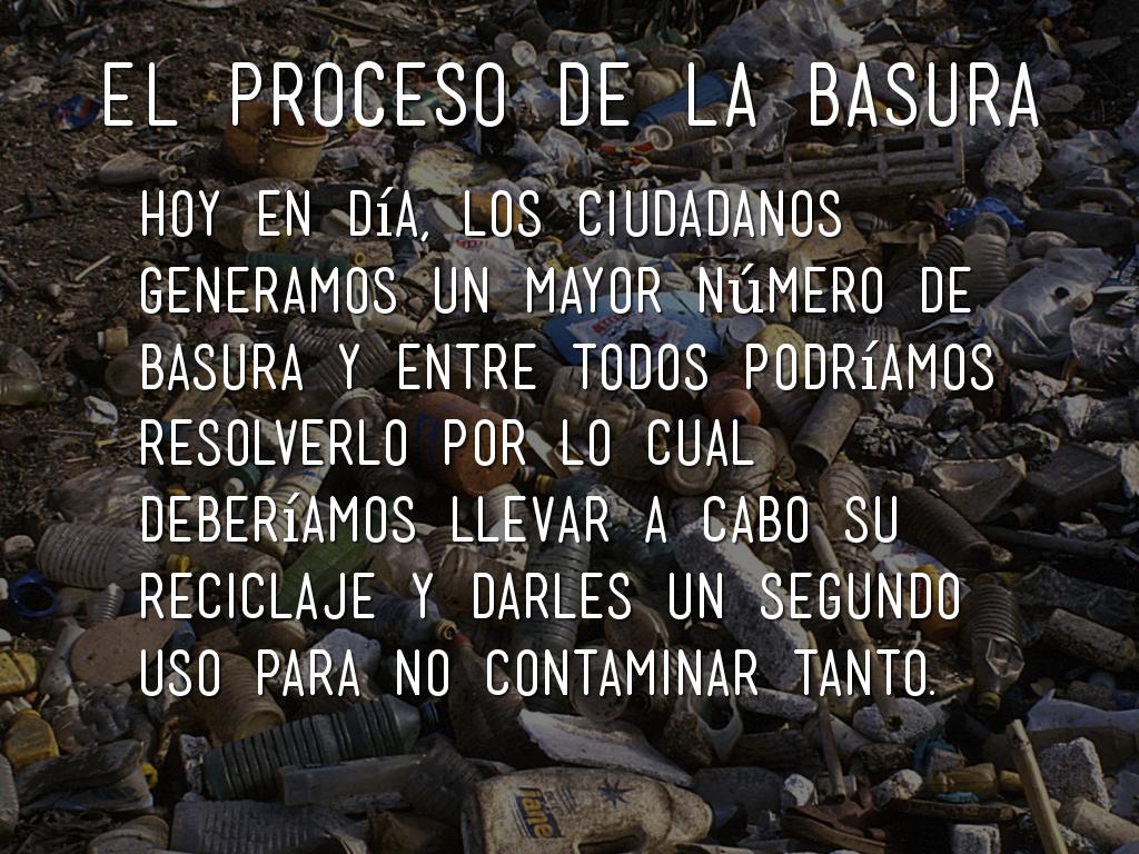 Hoy en día, los ciudadanos generamos un mayor número de basura y entre todos podríamos resolverlo por lo cual deberíamos llevar a cabo su reciclaje y darles un segundo uso para no contaminar tanto.