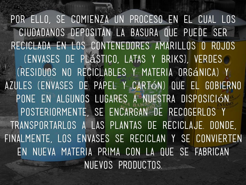 Por ello, se comienza un proceso en el cual los ciudadanos depositan la basura que puede ser reciclada en los contenedores amarillos o rojos (envases de plástico, latas y briks), verdes (residuos no reciclables y materia orgánica) y azules (envases de papel y cartón) que el gobierno pone en algunos lugares a nuestra disposición. Posteriormente, se encargan de recogerlos y transportarlos a las plantas de reciclaje. Donde, finalmente, los envases se reciclan y se convierten en nueva materia prima con la que se fabrican nuevos productos.
