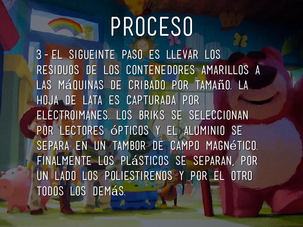 3-el sigueinte paso es llevar los residuos de los contenedores amarillos a las máquinas de cribado por tamaño. La hoja de lata es capturada por electroimanes. Los briks se seleccionan por lectores ópticos y el aluminio se separa en un tambor de campo magnético. Finalmente los plásticos se separan, por un lado los poliestirenos y por el otro todos los demás.
