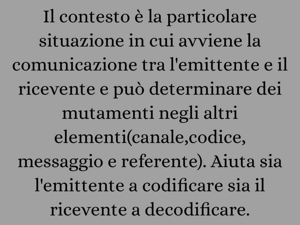 Il contesto è la particolare situazione in cui avviene la comunicazione tra l'emittente e il ricevente e può determinare dei mutamenti negli altri elementi(canale,codice,