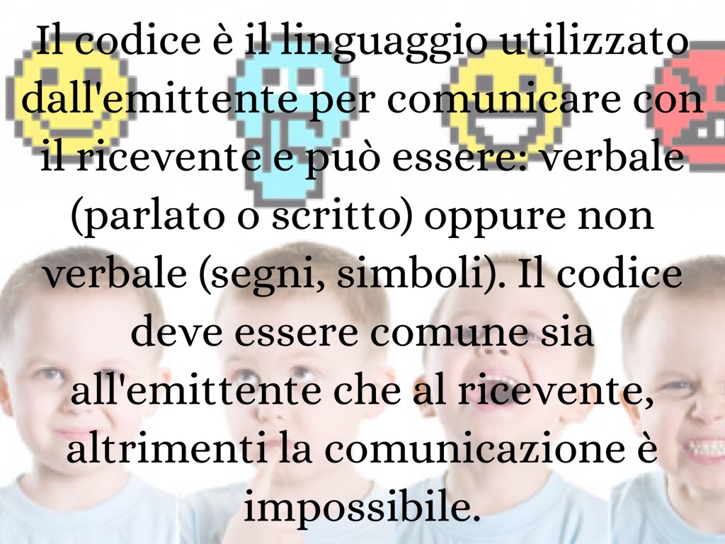 Il codice è il linguaggio utilizzato dall'emittente per comunicare con il ricevente e può essere: verbale (parlato o scritto) oppure non verbale (segni, simboli). Il codice deve essere comune sia all'emittente che al ricevente, altrimenti la comunicazione è impossibile.