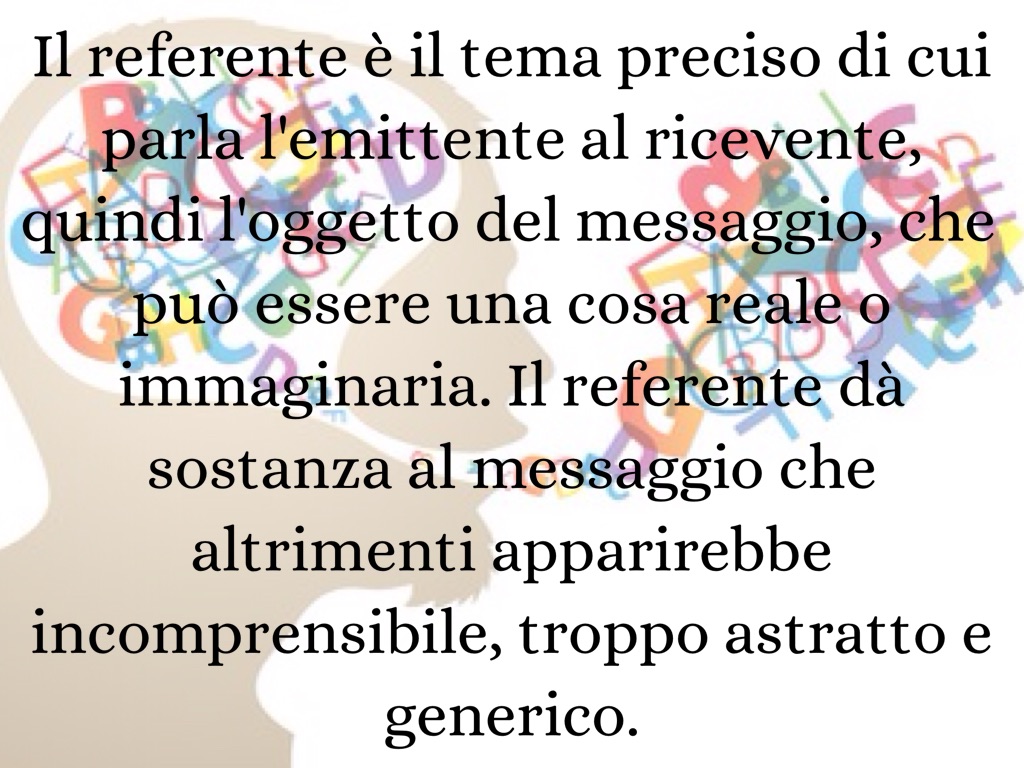 Il referente è il tema preciso di cui parla l'emittente al ricevente, quindi l'oggetto del messaggio, che può essere una cosa reale o immaginaria. Il referente dà sostanza al messaggio che altrimenti apparirebbe incomprensibile, troppo astratto e generico.