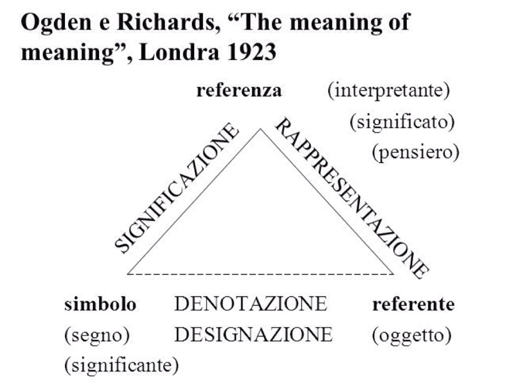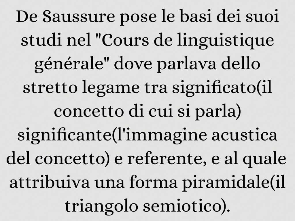De Saussure pose le basi dei suoi studi nel "Cours de linguistique générale" dove parlava dello stretto legame tra significato(il concetto di cui si parla) significante(l'immagine acustica del concetto) e referente, e al quale attribuiva una forma piramidale(il triangolo semiotico).