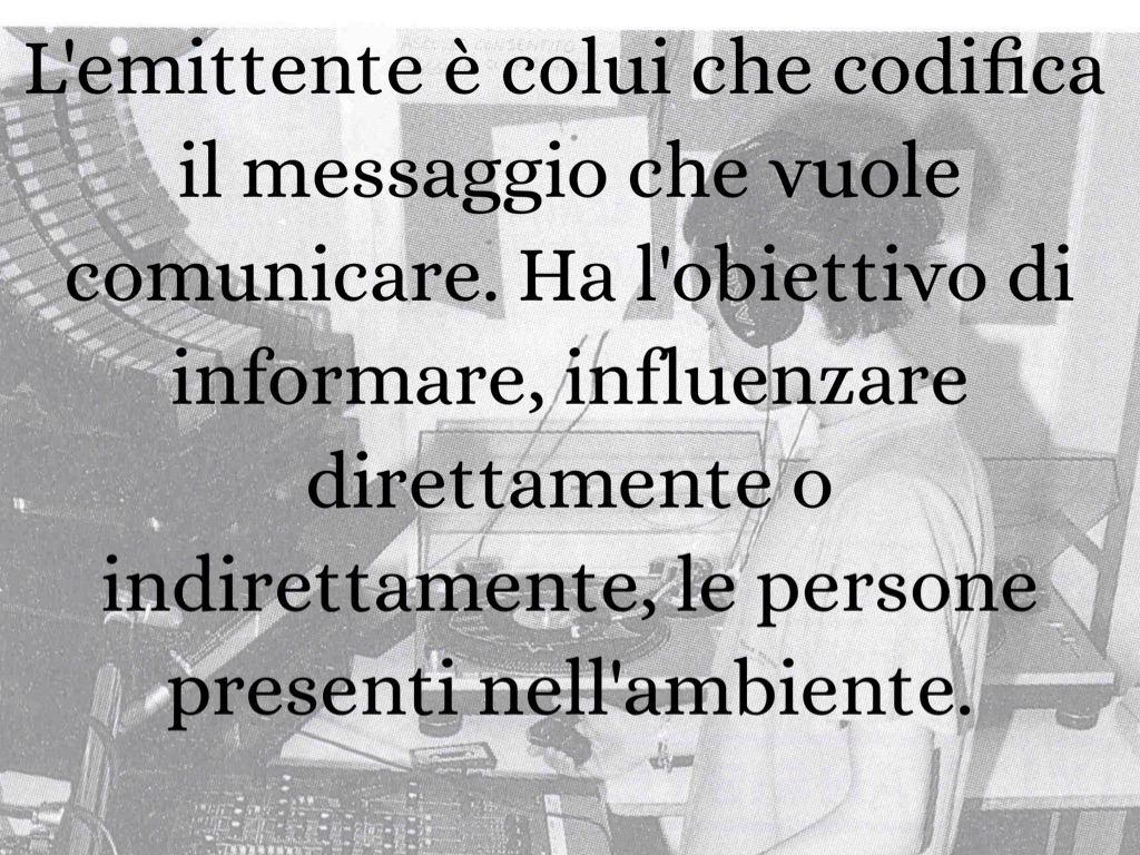 L'emittente è colui che codifica il messaggio che vuole comunicare. Ha l'obiettivo di informare, influenzare direttamente o indirettamente, le persone presenti nell'ambiente.