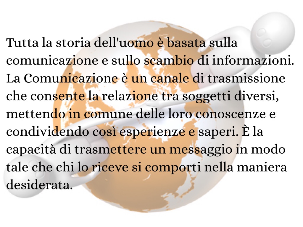 La Comunicazione è un canale di trasmissione che consente la relazione tra soggetti diversi, mettendo in comune delle loro conoscenze e condividendo così esperienze e saperi. È la capacità di trasmettere un messaggio in modo tale che chi lo riceve si comporti nella maniera desiderata.