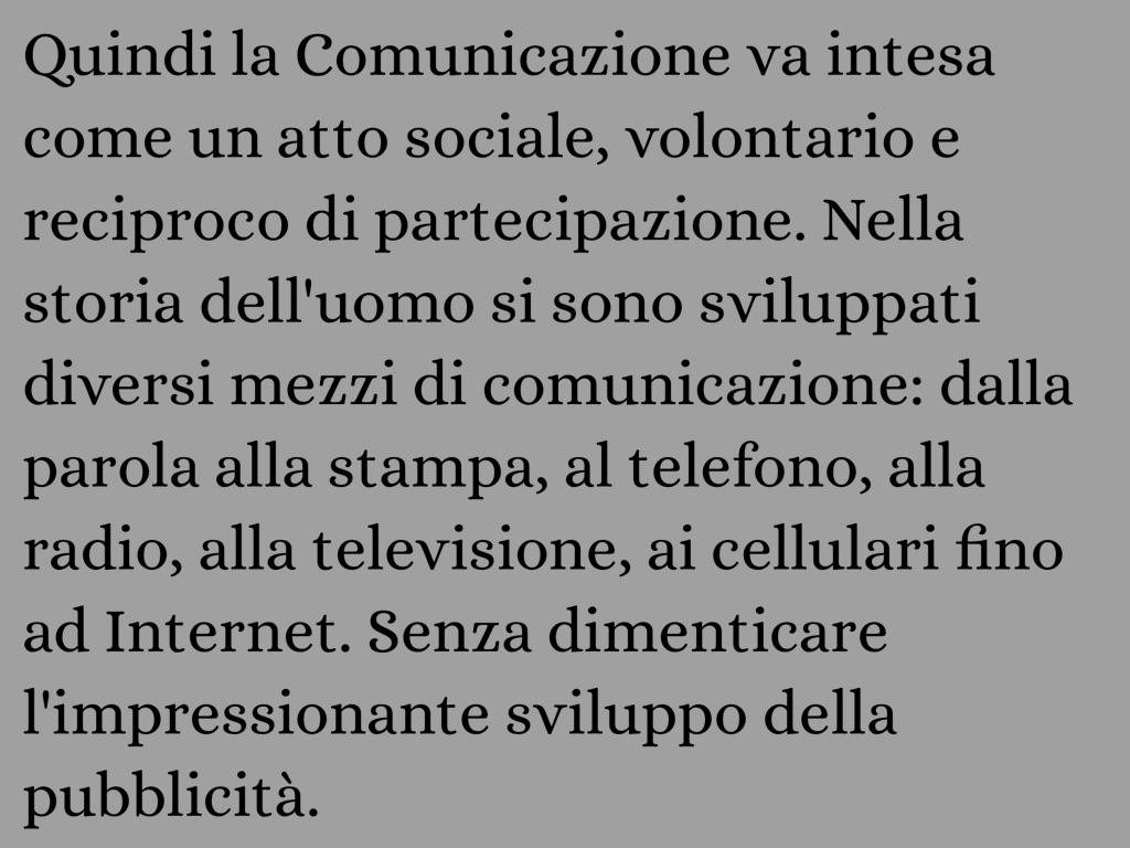Quindi la Comunicazione va intesa come un atto sociale, volontario e reciproco di partecipazione. Nella storia dell'uomo si sono sviluppati diversi mezzi di comunicazione: dalla parola alla stampa, al telefono, alla radio, alla televisione, ai cellulari fino ad Internet. Senza dimenticare l'impressionante sviluppo della pubblicità.