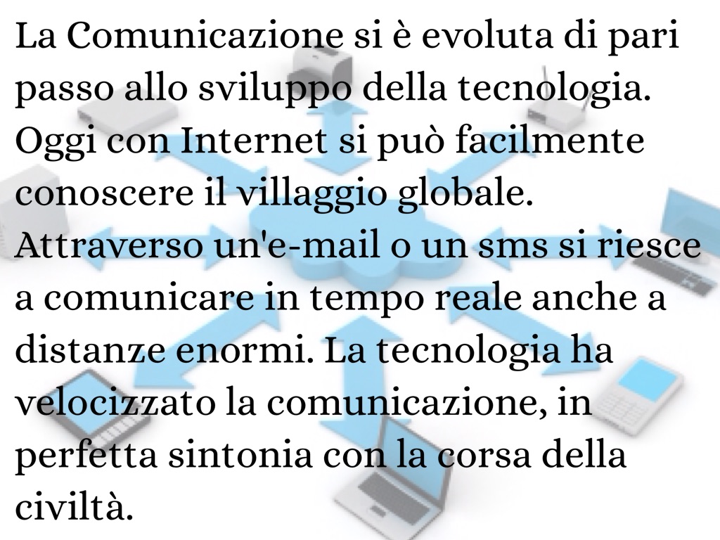 La Comunicazione si è evoluta di pari passo allo sviluppo della tecnologia. Oggi con Internet si può facilmente conoscere il villaggio globale. Attraverso un'e-mail o un sms si riesce a comunicare in tempo reale anche a distanze enormi. La tecnologia ha velocizzato la comunicazione, in perfetta sintonia con la corsa della civiltà.