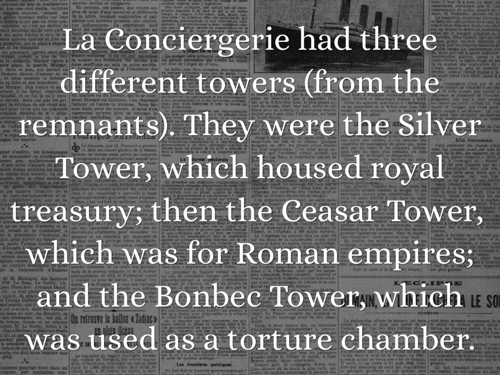 La Conciergerie had three different towers (from the remnants). They were the Silver Tower, which housed royal treasury; then the Ceasar Tower, which was for Roman empires; and the Bonbec Tower, which was used as a torture chamber.