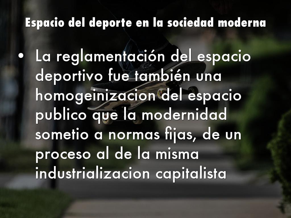 La reglamentación del espacio deportivo fue también una homogeinizacion del espacio publico que la modernidad sometio a normas fijas, de un proceso al de la misma industrializacion capitalista