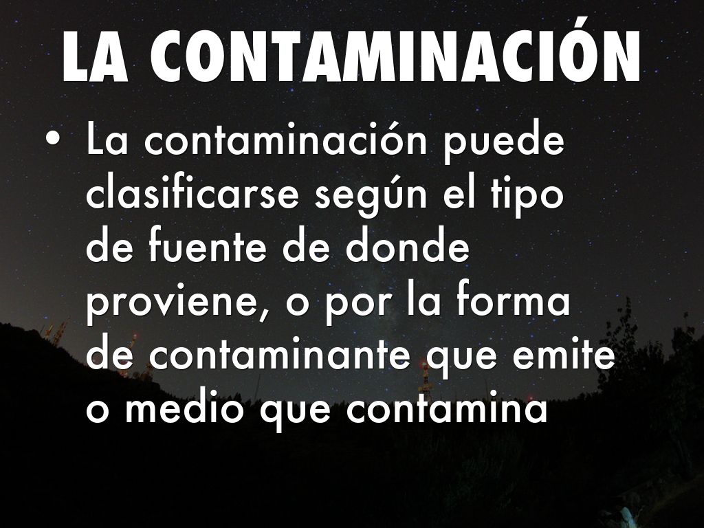 • La contaminación puede clasificarse según el tipo de fuente de donde proviene, o por la forma de contaminante que emite o medio que contamina