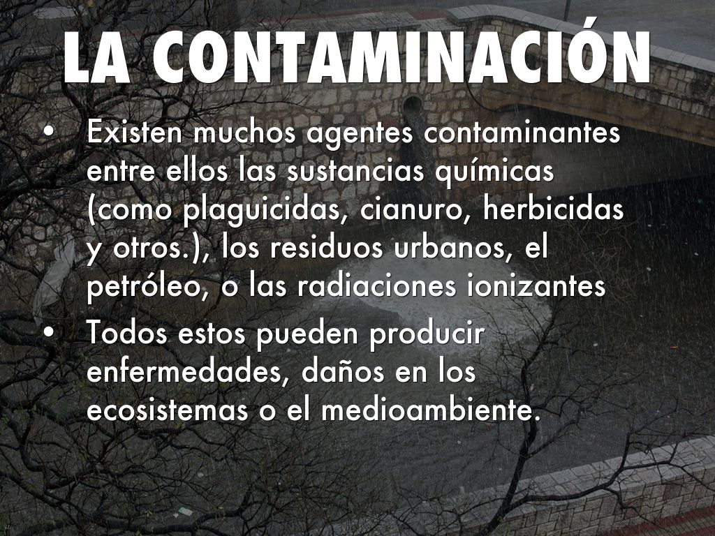 • Existen muchos agentes contaminantes entre ellos las sustancias químicas (como plaguicidas, cianuro, herbicidas y otros.), los residuos urbanos, el petróleo, o las radiaciones ionizantes
