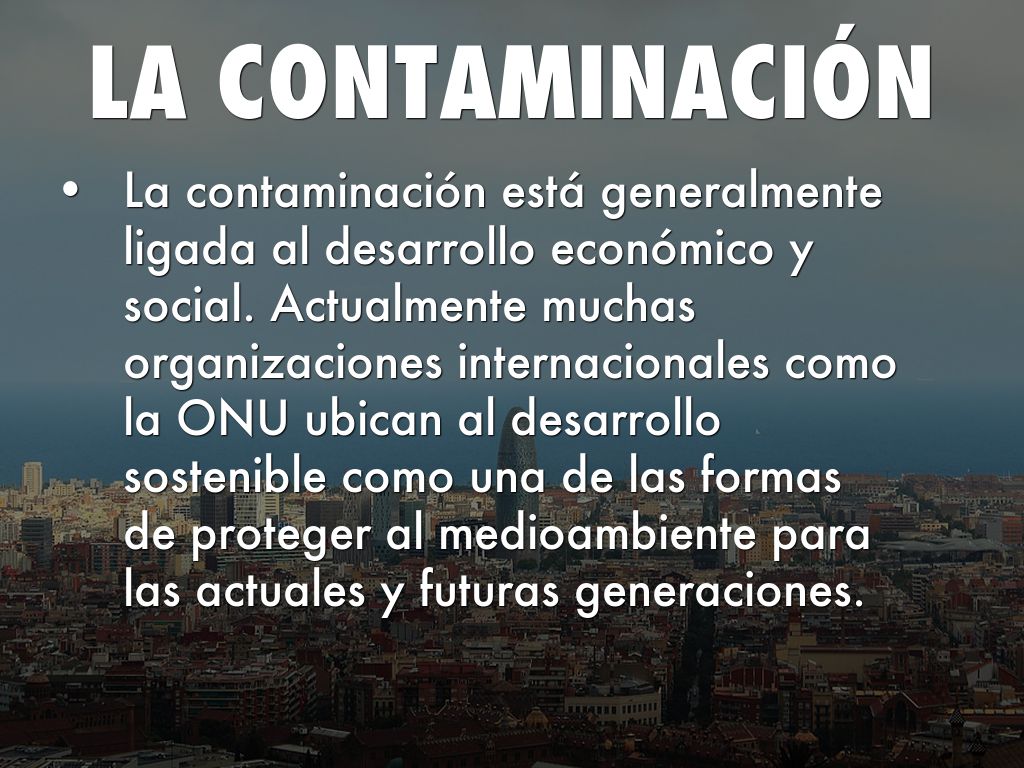 • La contaminación está generalmente ligada al desarrollo económico y social. Actualmente muchas organizaciones internacionales como la ONU ubican al desarrollo sostenible como una de las formas de proteger al medioambiente para las actuales y futuras generaciones.