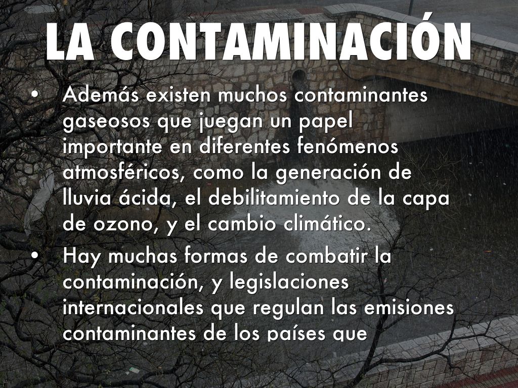 • Además existen muchos contaminantes gaseosos que juegan un papel importante en diferentes fenómenos atmosféricos, como la generación de lluvia ácida, el debilitamiento de la capa de ozono, y el cambio climático.