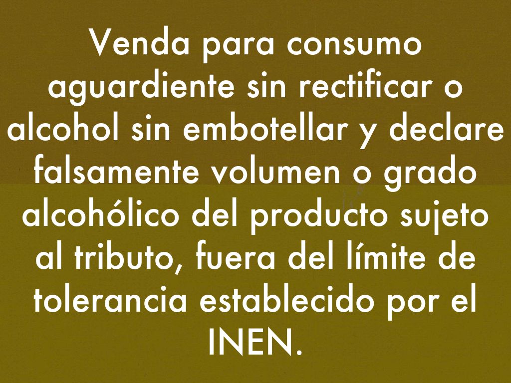 Venda para consumo aguardiente sin rectificar o alcohol sin embotellar y declare falsamente volumen o grado alcohólico del producto sujeto al tributo, fuera del límite de tolerancia establecido por el INEN.