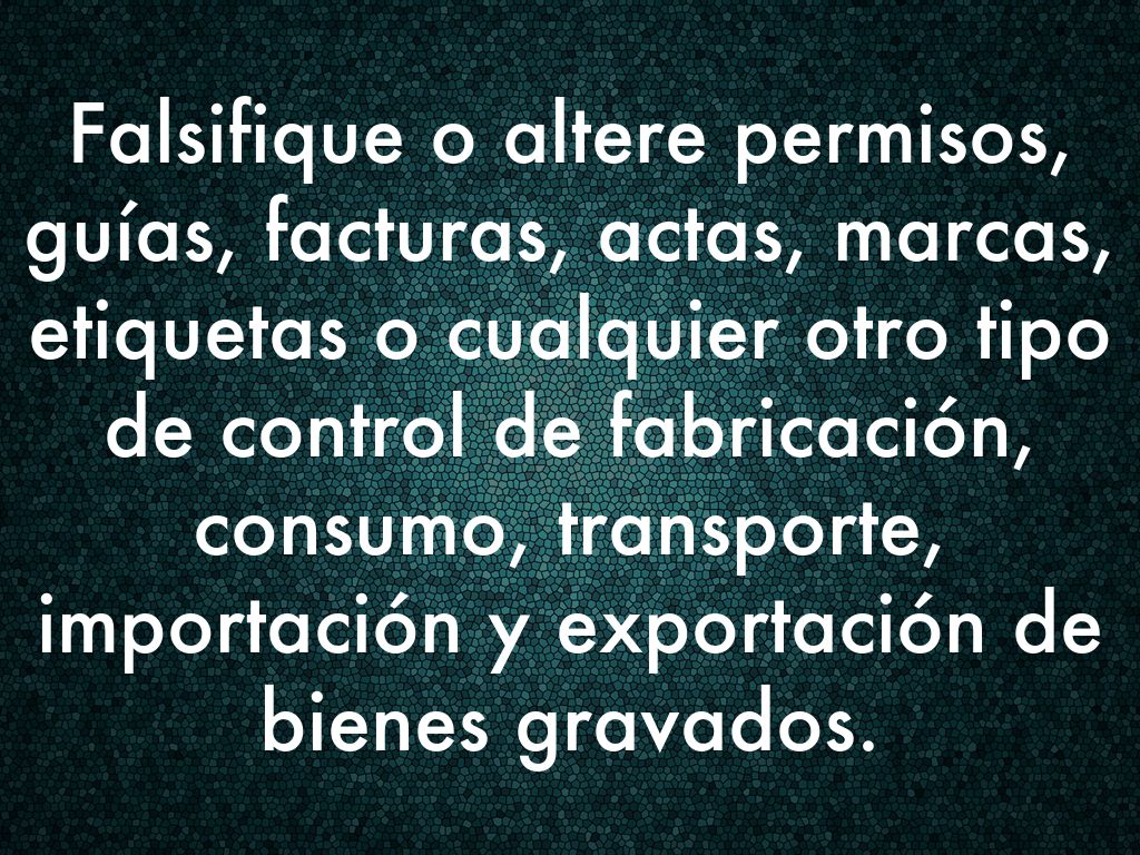 Falsifique o altere permisos, guías, facturas, actas, marcas, etiquetas o cualquier otro tipo de control de fabricación, consumo, transporte, importación y exportación de bienes gravados.