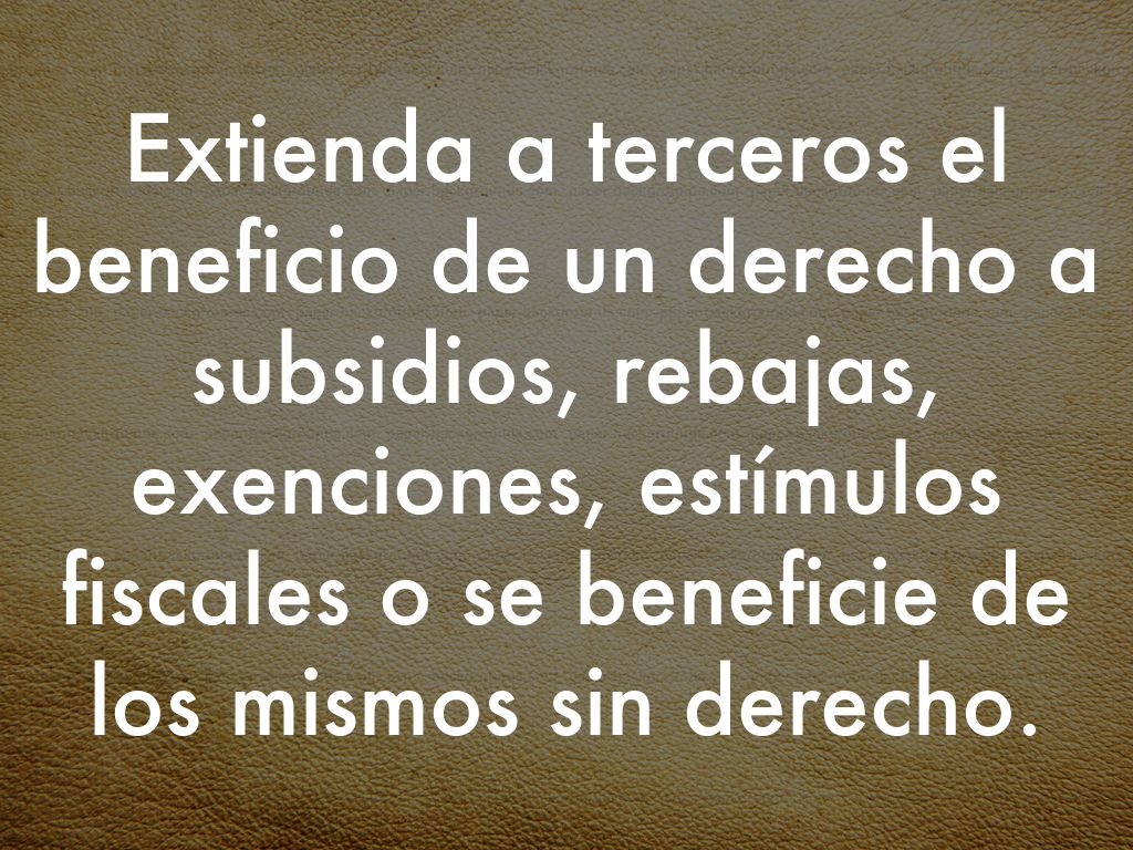 Extienda a terceros el beneficio de un derecho a subsidios, rebajas, exenciones, estímulos fiscales o se beneficie de los mismos sin derecho.