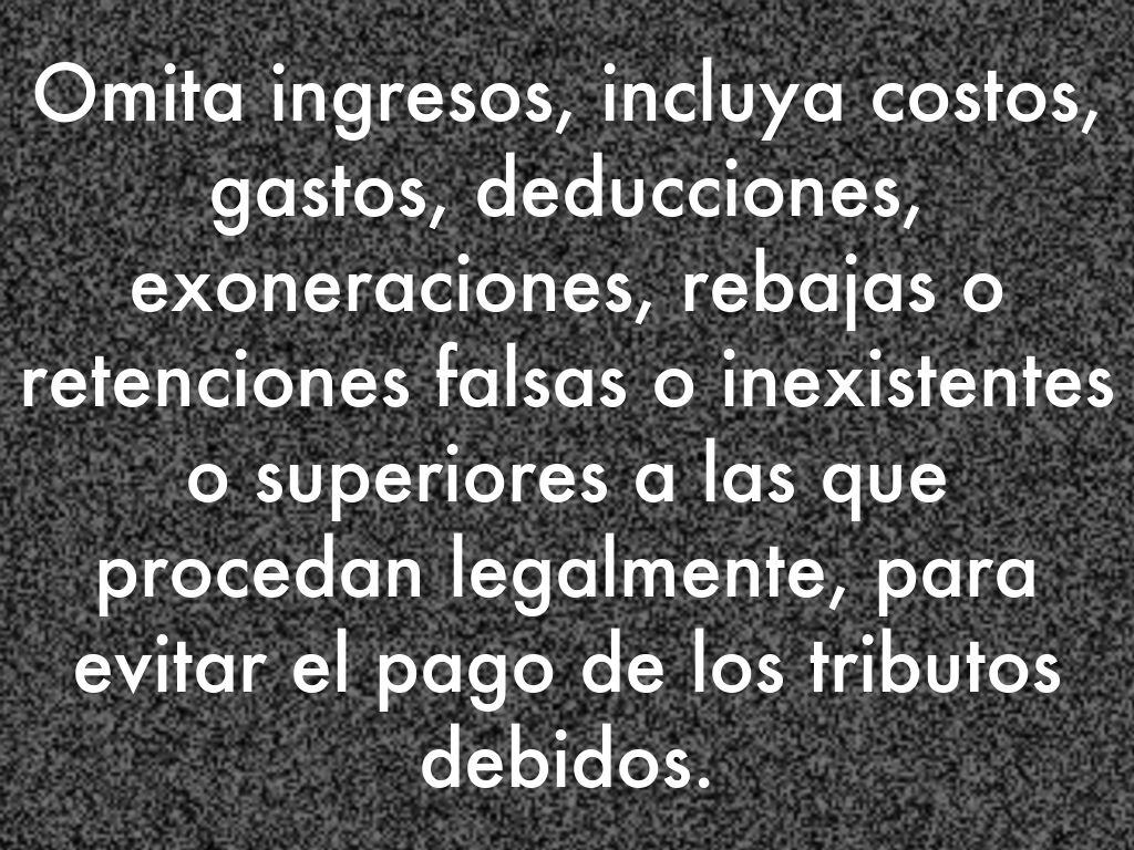 Omita ingresos, incluya costos, gastos, deducciones, exoneraciones, rebajas o retenciones falsas o inexistentes o superiores a las que procedan legalmente, para evitar el pago de los tributos debidos.