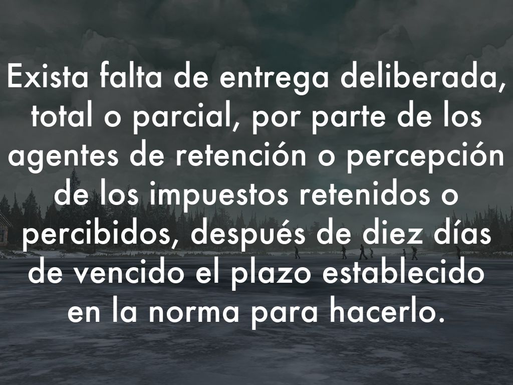 Exista falta de entrega deliberada, total o parcial, por parte de los agentes de retención o percepción de los impuestos retenidos o percibidos, después de diez días de vencido el plazo establecido en la norma para hacerlo.