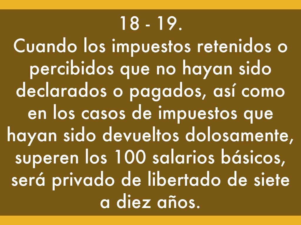 Cuando los impuestos retenidos o percibidos que no hayan sido declarados o pagados, así como en los casos de impuestos que hayan sido devueltos dolosamente, superen los 100 salarios básicos, será privado de libertado de siete a diez años.
